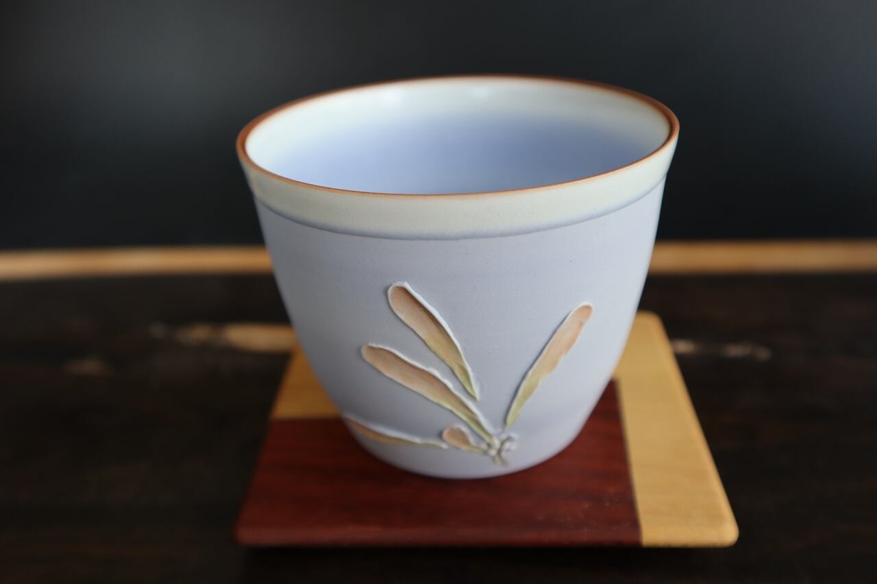 素焼き後、青く発色する素材をデザイン以外の外側に施し
