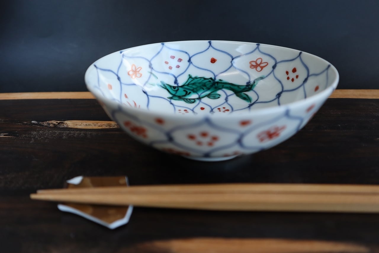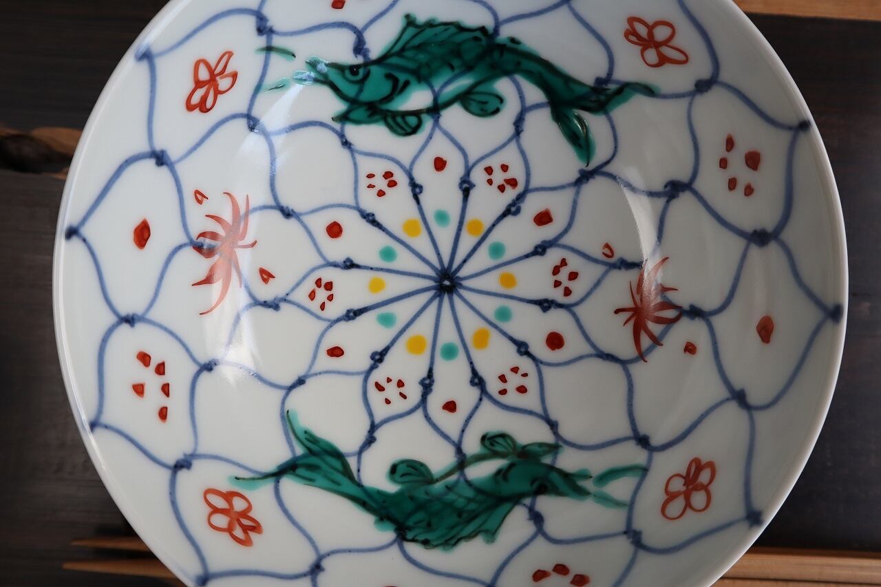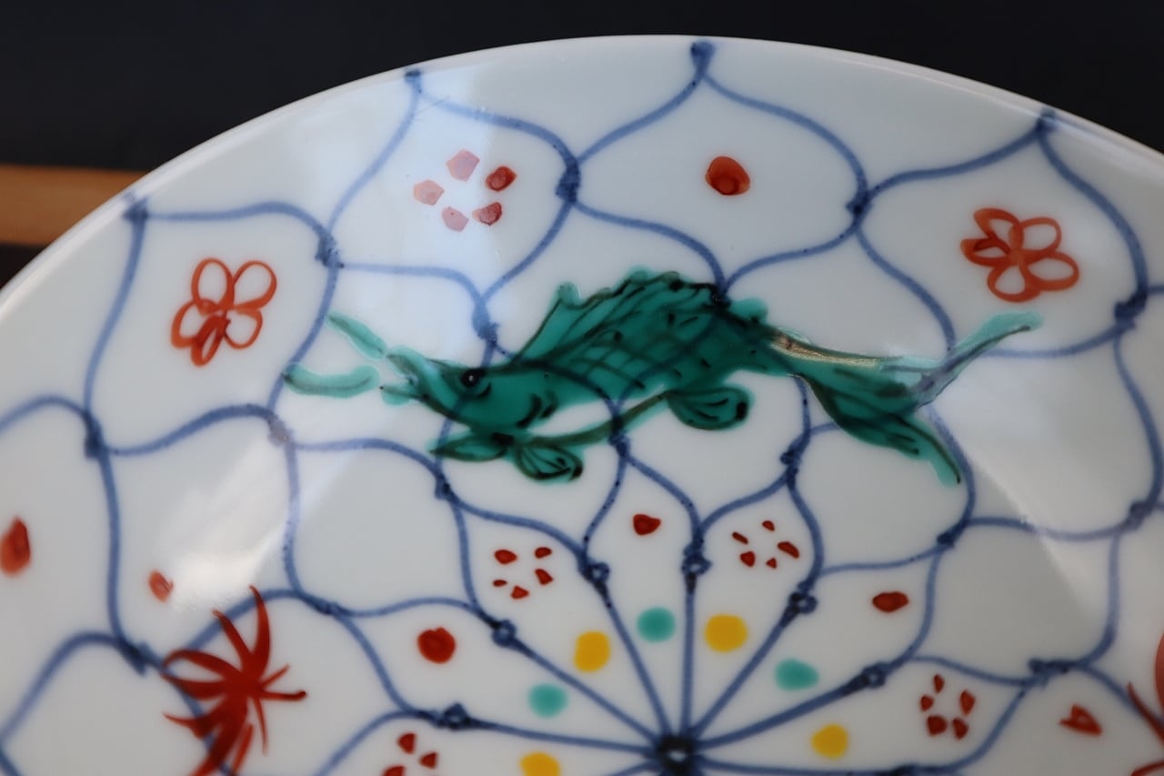 魚を上絵和青にて手描きしています。