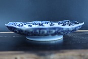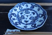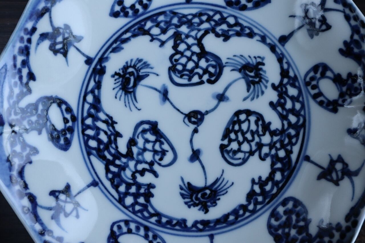 手描きの染付六角打ち込み皿です。