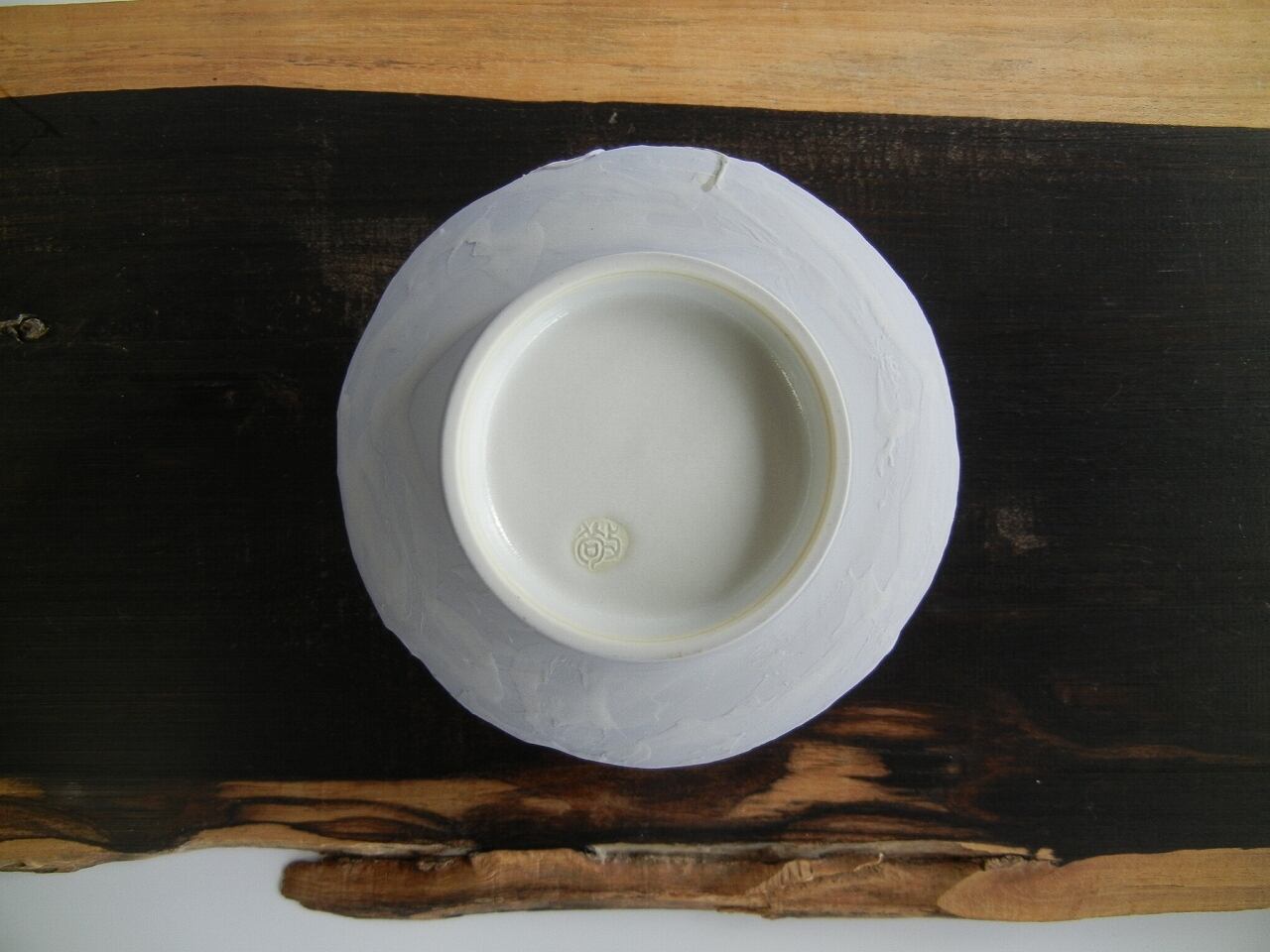 素材は磁器で手作りロクロ成型で水挽して、すぐに扁形させています。