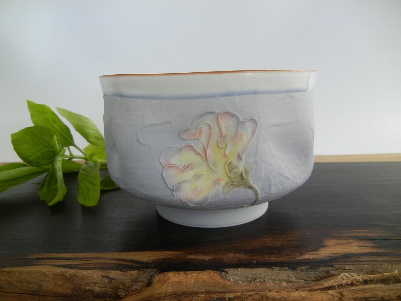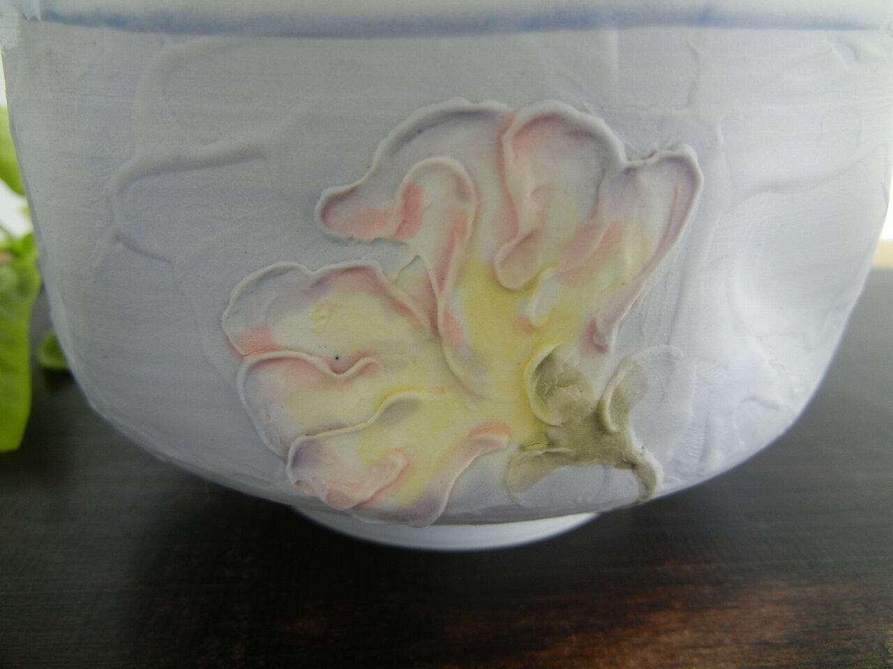 泥漿を塗り、花のデザインを盛土し彩色しています。