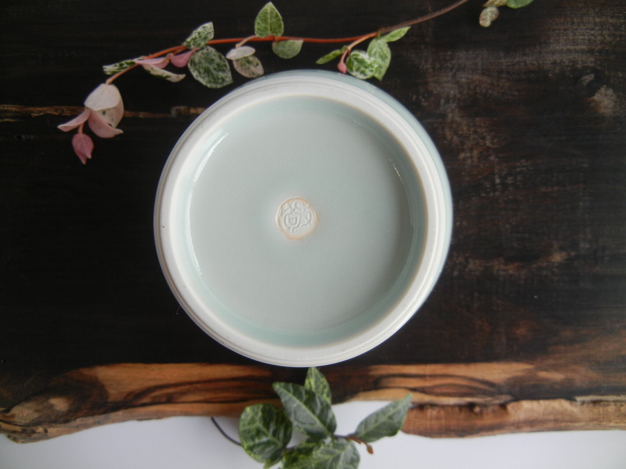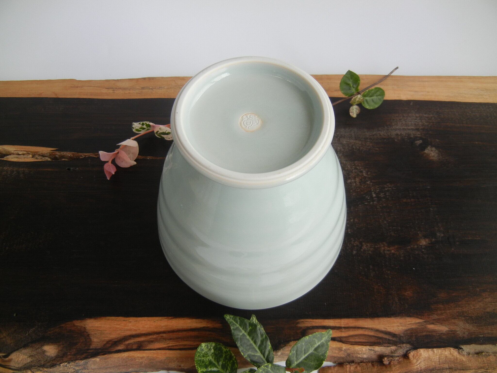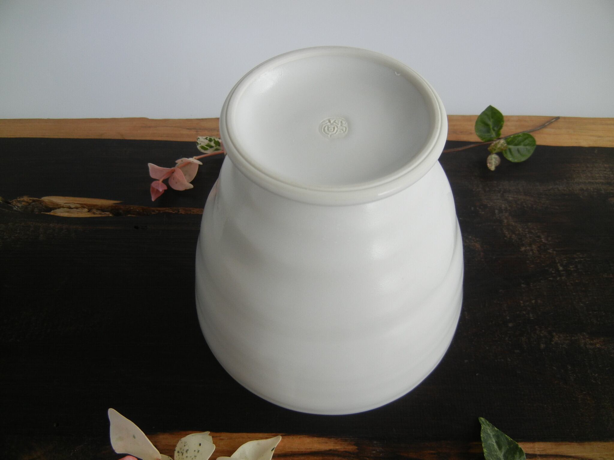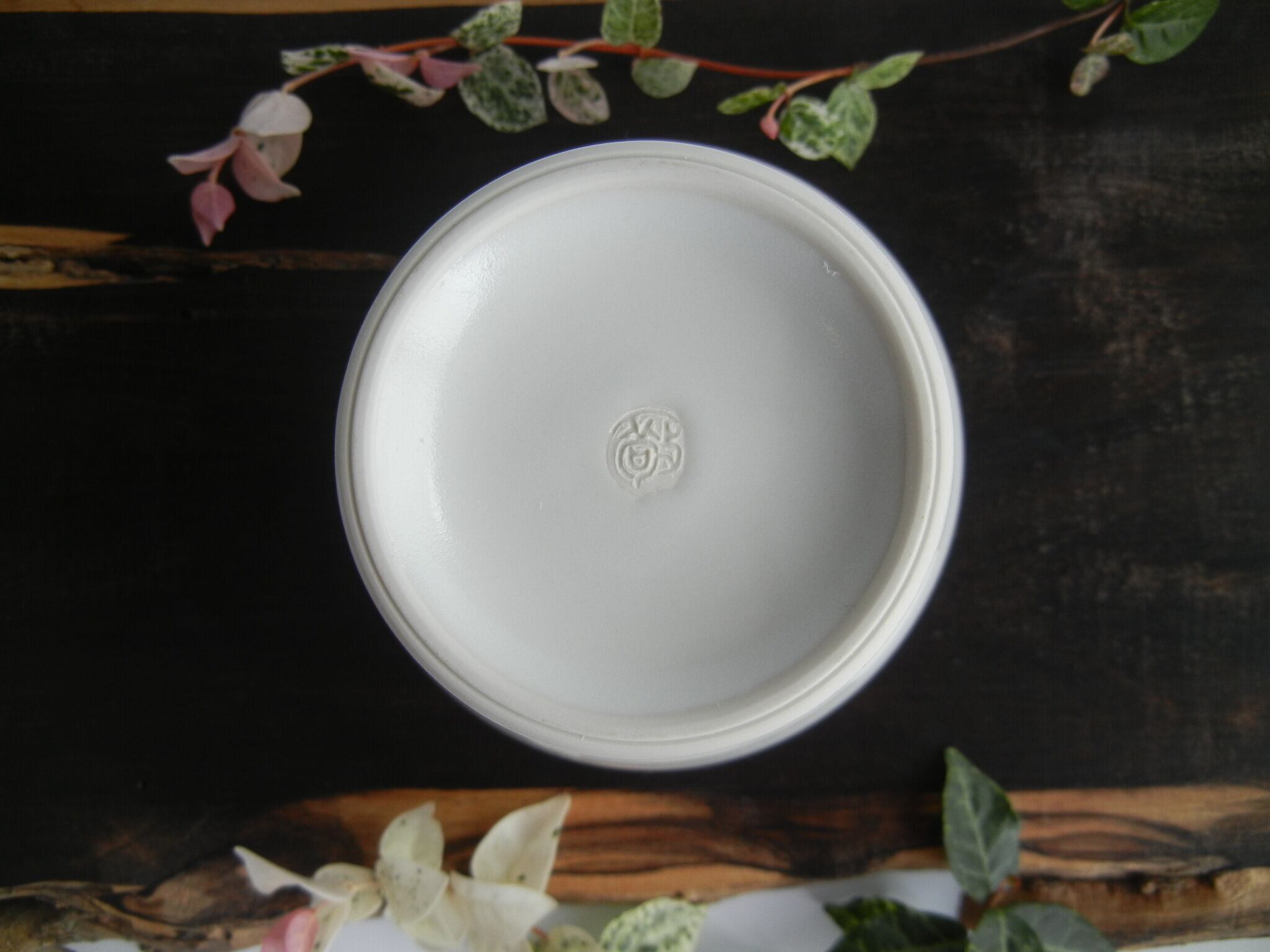 素材は磁器で手作りロクロ成型で水挽の最後に大きく「指すじ」をいれます。