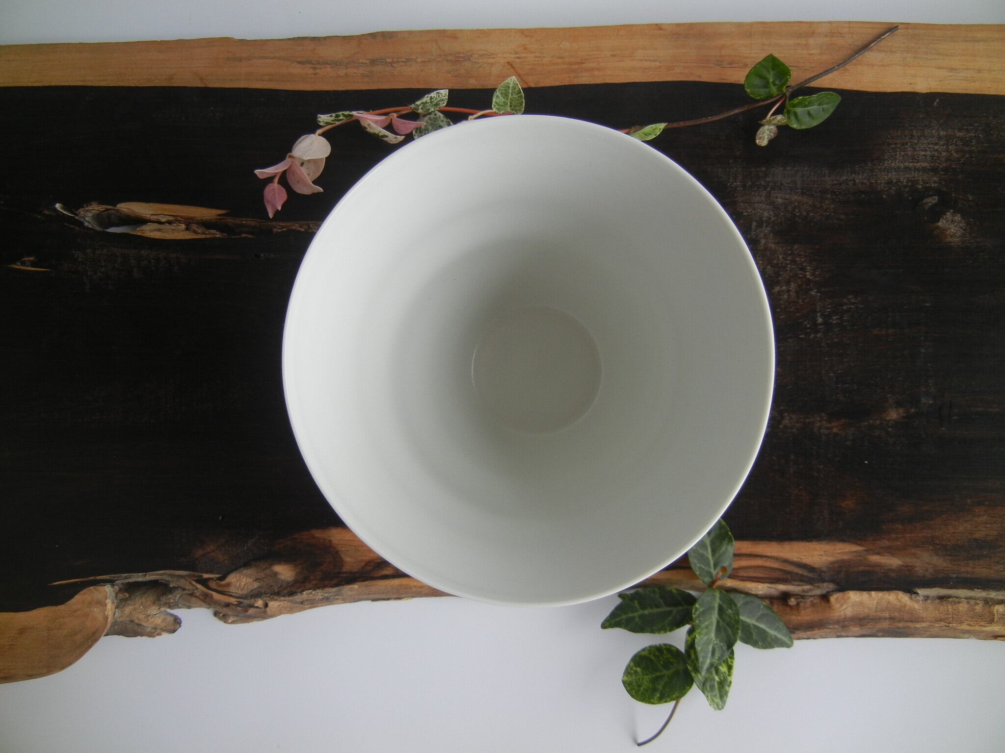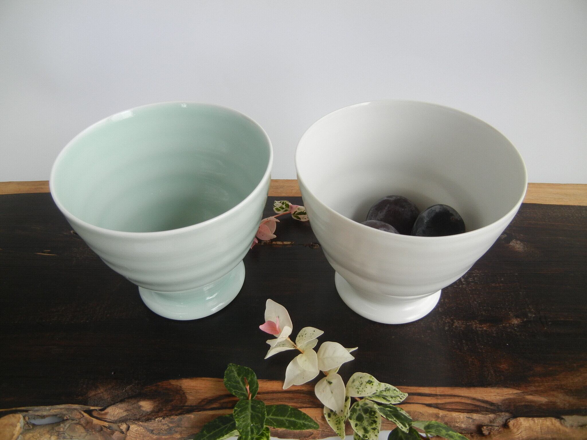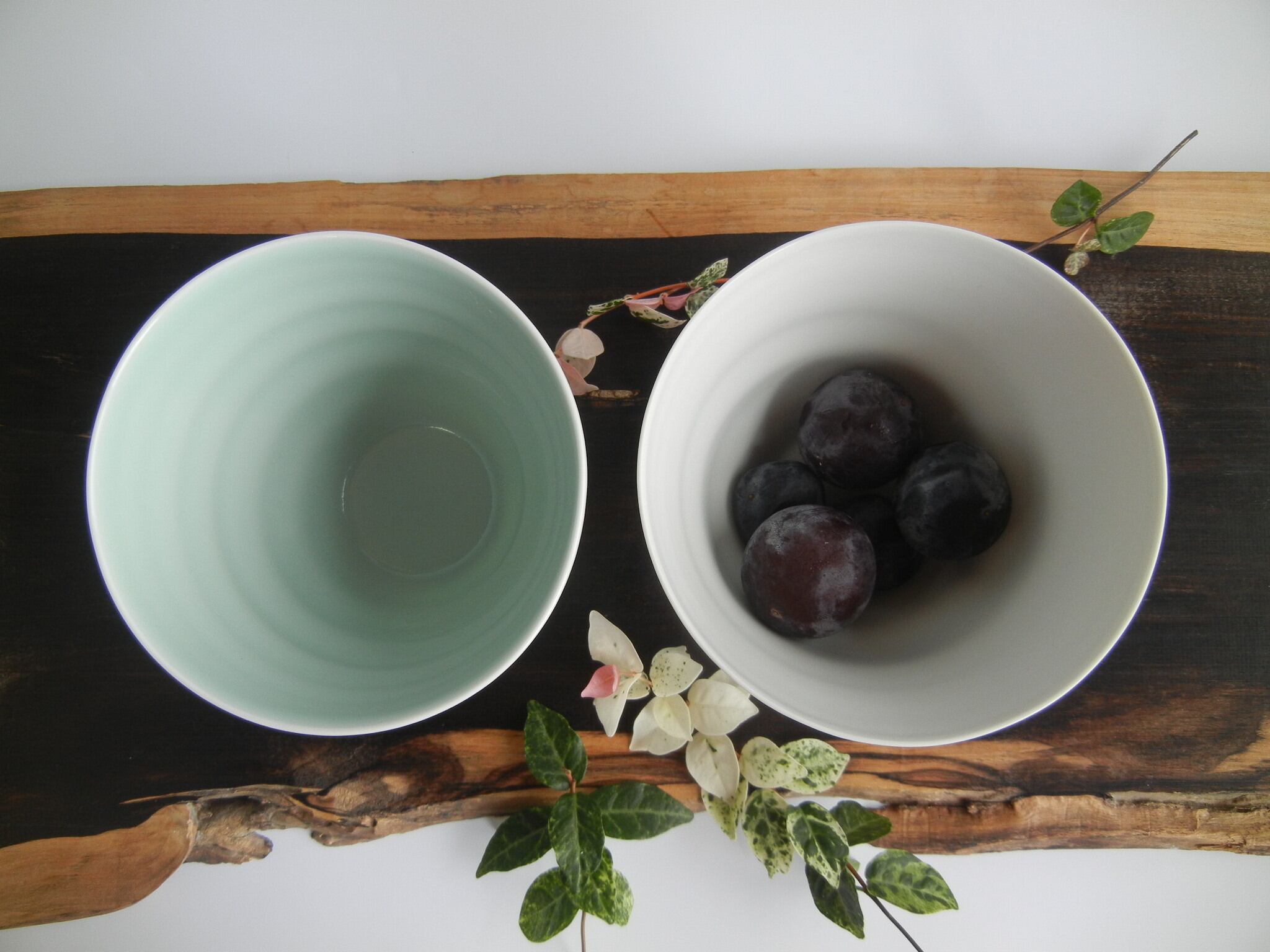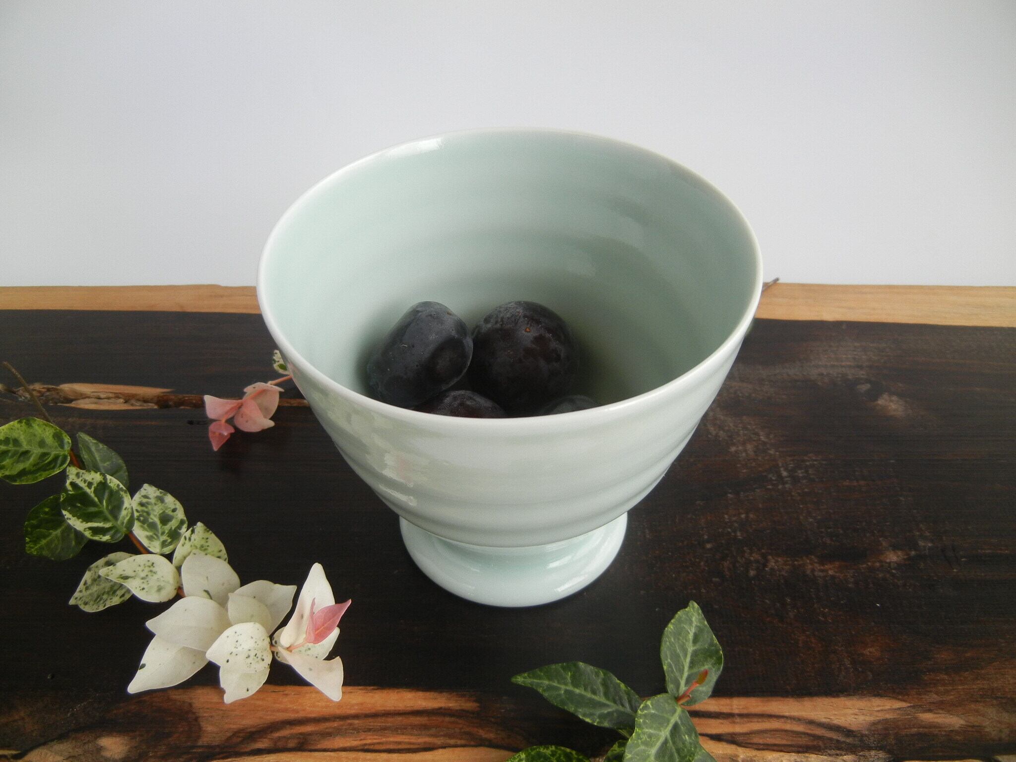 素材は磁器で手作りロクロ成型で水挽の最後に大きく「指すじ」をいれます。