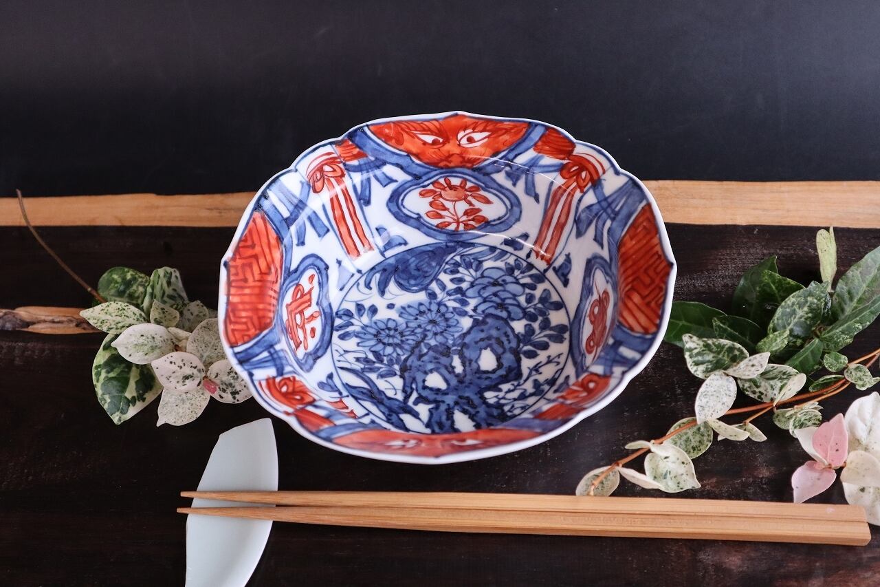 染付赤絵芙蓉手岩花文兜鉢です。